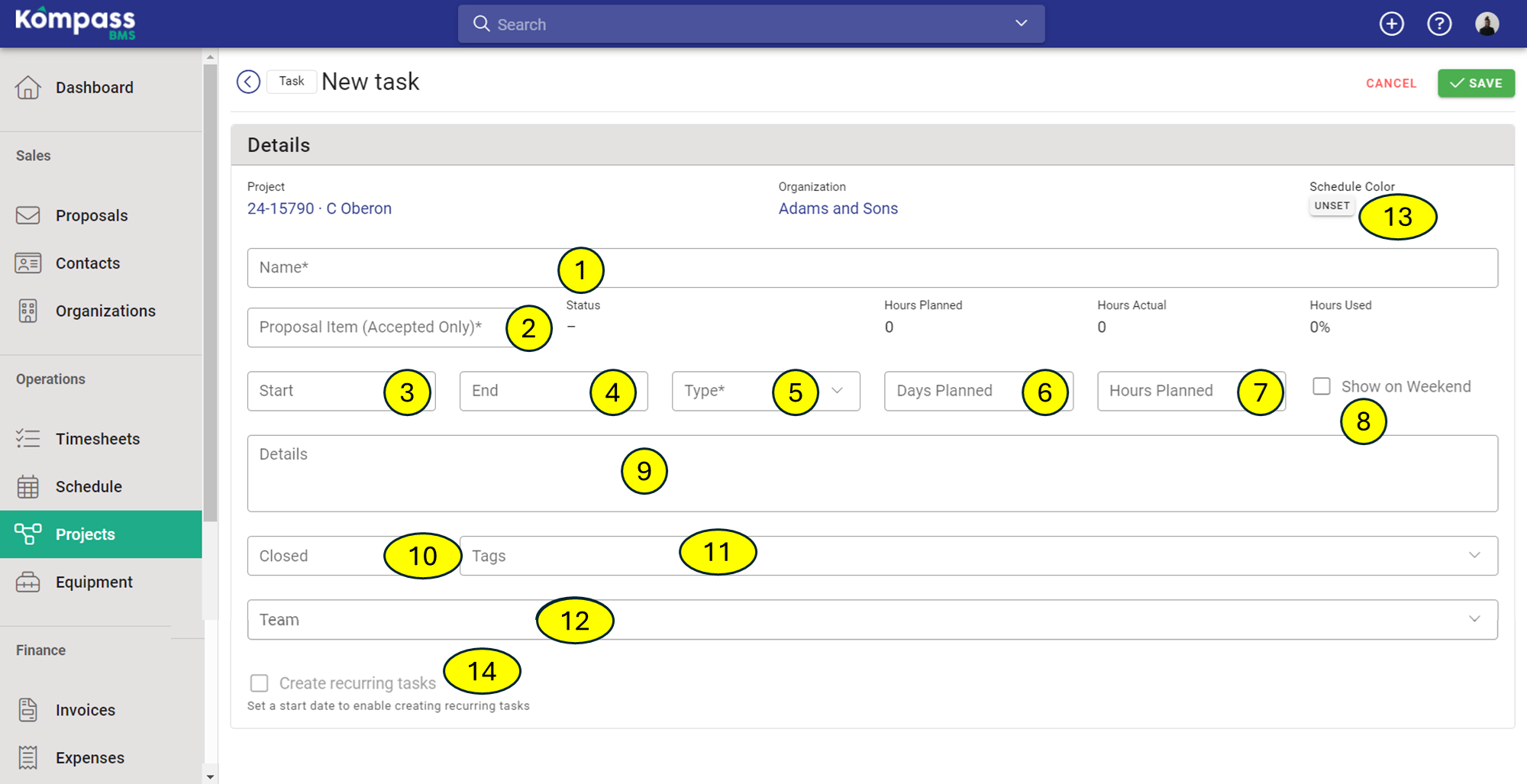 It is common for your teams to have to periodically visit a specific project. If this is the case, you will need to create multiple tasks for certain employees so that they know they are booked in the future. To do this, you will have to set recurring tasks by ticking the box as shown above (mark 14).