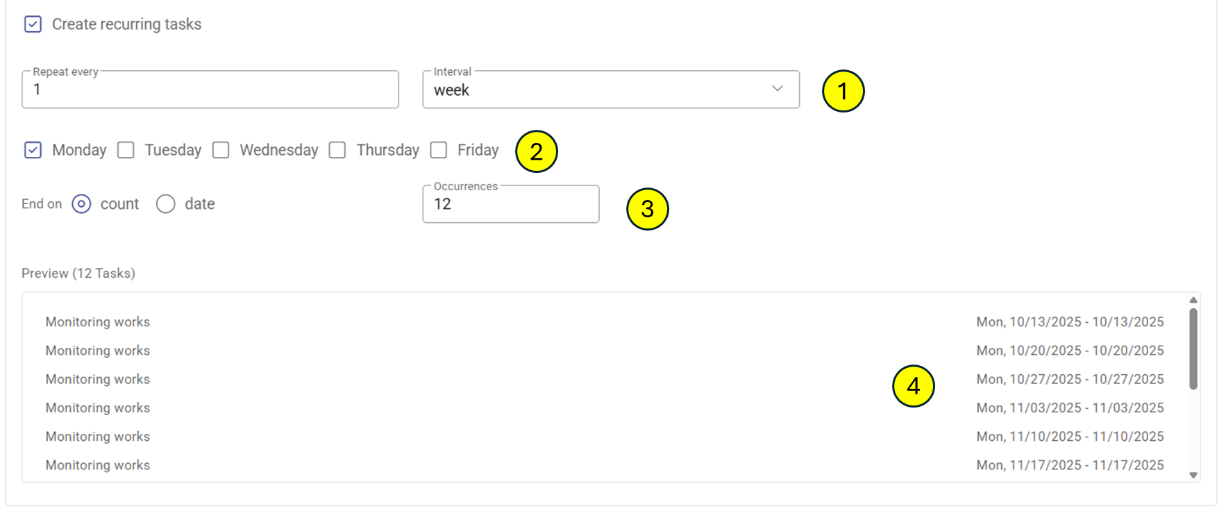 - Set an end date either with a count of occurrences or a specific end date.
